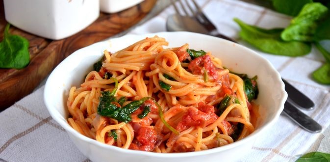 Така страва нереально ароматна, смачна та апетитна на вигляд. Спагеті з помідорами та шпинатом прості у приготуванні. Вони чудово смакують в гарячому вигляді. Обов’язково приготуйте страву за цим рецептом.