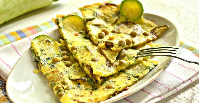 Така кабачкова закуска подається до столу в гарячому вигляді. Вона виходить дуже апетитною та ситною. Закуска з кабачків, яєць та зеленого горошку точно Вам сподобається.