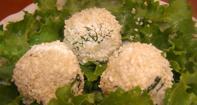З сирної суміші формуємо кульки невеликого розміру. Щедро обвалюємо їх в кунжуті. Готові сирні кульки викладаємо в миску та відразу подаємо до столу. Смачного!