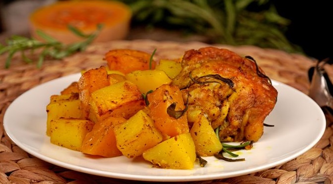 Страва виходить настільки ситною, що відразу зникає зі столу. Запечена курка з картоплею та гарбузом дуже апетитна на вигляд. Страва проста у приготуванні й бюджетна.