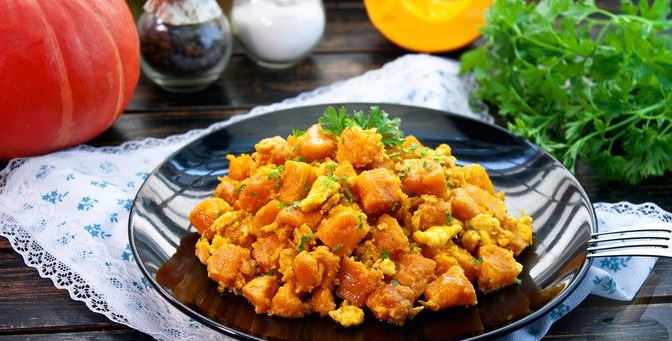 Страва нереально апетитна на вигляд. Смажений гарбуз з яйцями та соєвим соусом точно сподобається Вашим рідним. Така страва швидка у приготуванні та чудово смакує на обід.