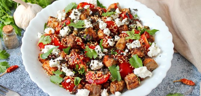 Салат зі смаженими баклажанами, помідорами, сиром та соусом чилі