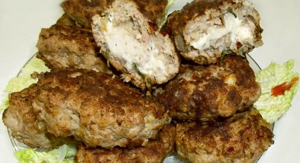 З фаршу робимо котлети. Всередину кладемо сирну начинку. Потім котлети викладаємо на сковорідку, змащену олією. Смажимо їх до рум’яності та відразу подаємо до столу. Смачного!
