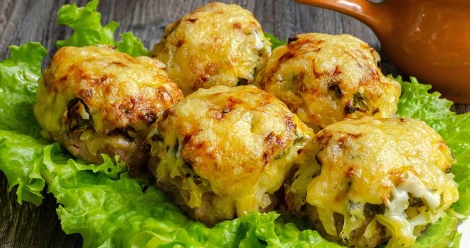 З готового фаршу робимо кульки. Формуємо в них заглиблення та викладаємо у форму, змащену олією. Моцарелу натираємо на тертці. М’ясні гнізда відправляємо в духовку та запікаємо 20 хвилин при температурі 180 градусів.