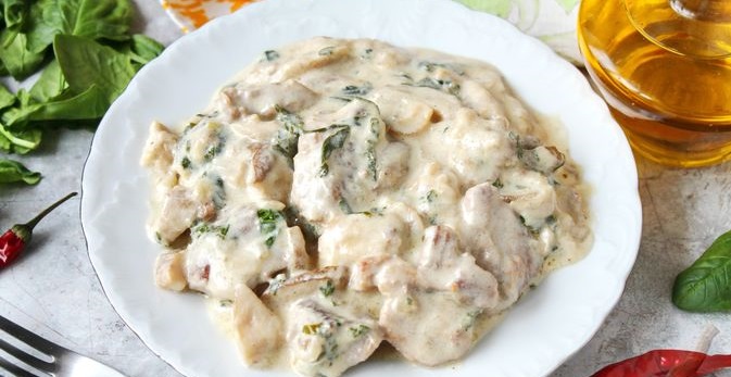Тим часом в мисці змішуємо сметану та борошно. Додаємо трохи води й перемішуємо. Готову суміш вливаємо до решти інгредієнтів. Потім додаємо нарізаний шпинат. Солимо та перчимо за смаком. Перемішуємо та тушкуємо страву до готовності. Смачного!