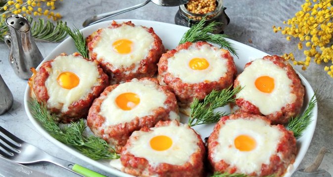 Дістаємо їх з духовки. В кожне м’ясне гніздо вбиваємо перепелине яйце. Зверху страву посипаємо моцарелою та повертаємо в духовку. Гнізда готуємо ще приблизно 7 хвилин та подаємо до столу. Смачного!