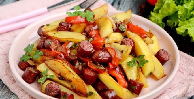Страва нереально ситна та апетитна на вигляд. Вона готується просто й швидко. Запечена картопля з ковбасками та солодким перцем сподобається всій Вашій родині. Вона має чудовий аромат та ніжний смак.