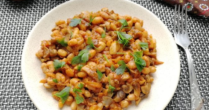 Страва чудово смакує в гарячому вигляді. Така тушкована квасоля дуже ситна та апетитна. Готується вона швидко й просто. Квасоля, тушкована з грибами в томатному соусі сподобається всій сім’ї.