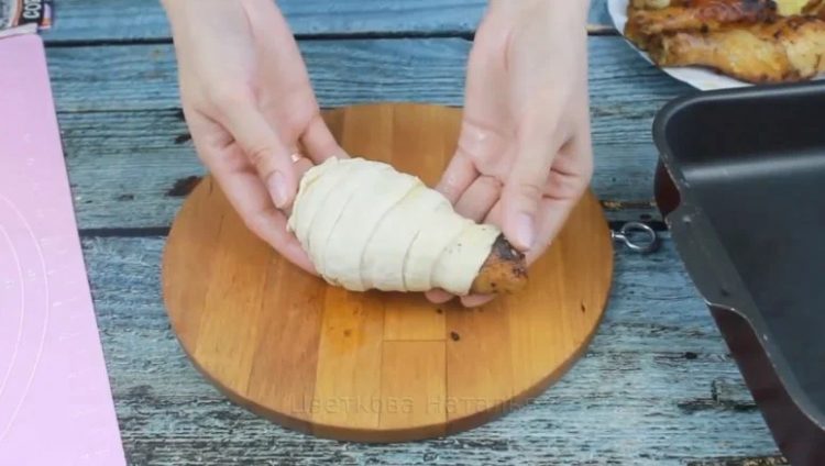Форму для запікання змащуємо олією або застилаємо пергаментним папером. Тепер кожну ніжку загортаємо в тісто навхлест, як показано нижче. Кладемо заготовки, що вийшли, у форму на відстані одна від одної.