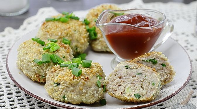З фаршу робимо котлети круглої форми. Обвалюємо їх в кунжуті та відразу викладаємо на розігріту сковорідку. Котлети смажимо до рум’яної скоринки та подаємо до столу гарячими. Смачного!