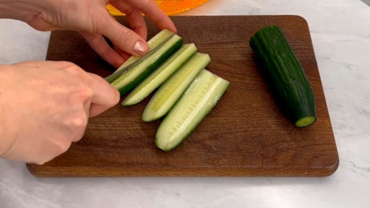 Для цієї закуски нам знадобиться довгий огірок. Спочатку зрізаємо з нього хвостики. Потім розрізаємо його навпіл і обрізаємо кожну половинку вздовж так, щоб максимально не зачепити серцевину з насінням – її ми використовувати не будемо.