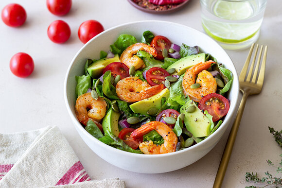 З’єднайте в салатнику зелень, креветки, помідори, авокадо, цибулю.