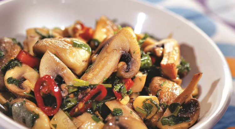 Печериці нарізаємо та викладаємо на сковорідку. Додаємо пропущений через прес часник та дрібно нарізаний гострий перець. Смажимо все на повільному вогні.