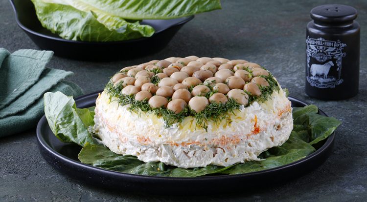 Салат відправляємо в холодильник на деякий час. Потім акуратно його перевертаємо й знімаємо харчову плівку. Салат “Грибна галявина” готовий. Смачного!