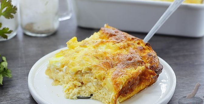 Потім солимо й перчимо за смаком. До яєчної суміші всипаємо смажену цибулю та тертий сир. Все перемішуємо. Форму змащуємо вершковим маслом та вливаємо туди яєчну суміш. Ставимо в духовку й запікаємо 30 хвилин при температурі 200 градусів.