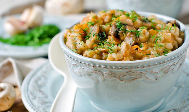 Гриби та ріпчасту цибулю нарізаємо кубиками та обсмажуємо до випаровування рідини. Солимо та перчимо. Перемішуємо й знімаємо з вогню.