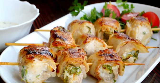 Шашлики з курячого філе в йогуртовому маринаді з беконом