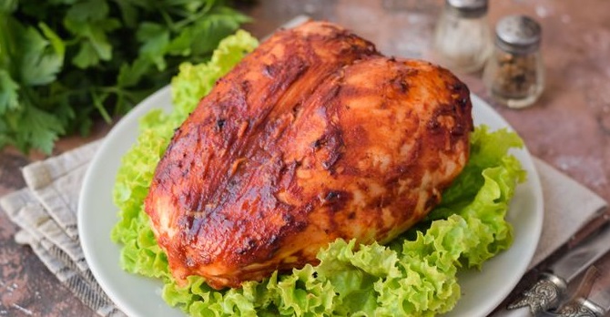 Курячу грудку щедро натираємо сіллю, перцем та паприкою. Потім змащуємо готовим маринадом та ставимо в холодильник на 50 хвилин. Потім грудку загортаємо у фольгу та запікаємо 40 хвилин при температурі 180 градусів. Знімаємо фольгу та готуємо м’ясо ще 15 хвилин. Смачного!
