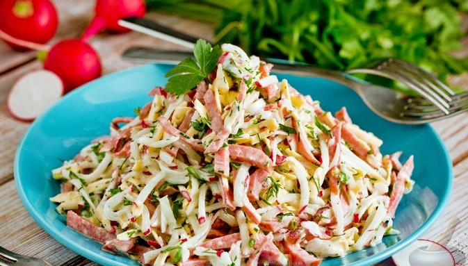 Салат дуже простий у приготуванні. Він виходить ніжним на смак та ситним. Салат з редиски, ковбаси та сиру надзвичайно апетитний на вигляд. Для його приготування знадобляться бюджетні інгредієнти.
