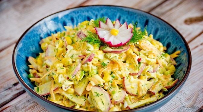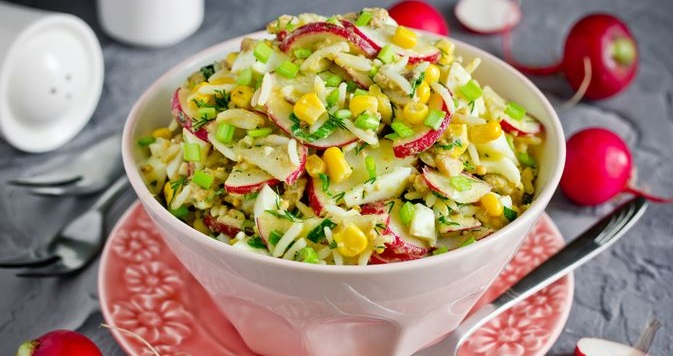 Салат з сардиною, редискою, кукурудзою, рисом та яйцями