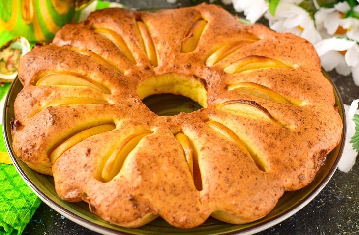 Борошно заздалегідь просіваємо та поступово додаємо до сиру. Акуратно замішуємо тісто. Потім викладаємо його у силіконову форму з отвором в центрі. З яблук видаляємо насіння та нарізаємо тоненькими шматочками. Викладаємо їх на тісто.