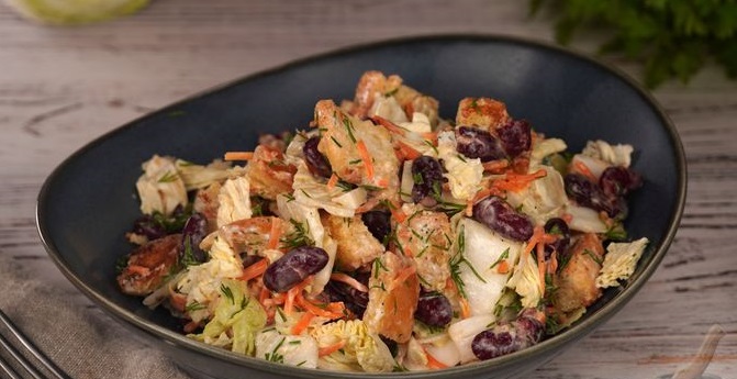 Салат з квасолею, морквою по-корейськи, пекінською капустою та сухариками