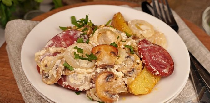 Така страва дуже швидка у приготуванні та бюджетна. Запечена картопля з грибами та ковбасою чудово смакує в гарячому вигляді. Вона виходить ніжною та апетитною. А ще страва дуже ситна.