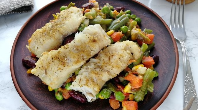 Сковорідку змащуємо олією та ставимо на вогонь. Викладаємо заморожені овочі та готуємо на повільному вогні під кришкою. Тим часом нарізаємо рибу. Солимо, перчимо та посипаємо приправою. Додаємо її до овочів. Перемішуємо та продовжуємо готувати.