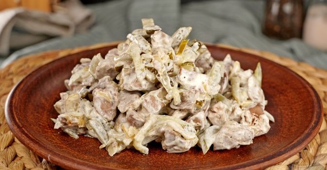 Салат з курячої печінки з маринованими огірками та смаженою цибулею