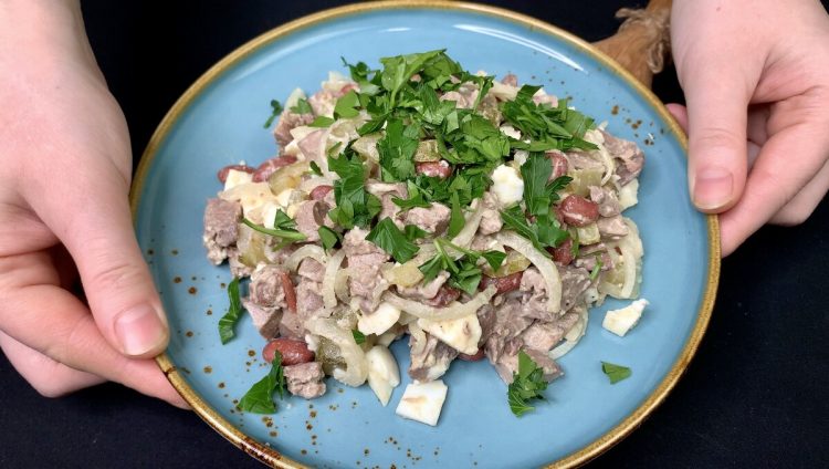 Готувати цей салат дуже просто: якщо все підготувати заздалегідь, на приготування підуть лічені хвилини. А поєднання продуктів в ньому просто дивовижне! Ніжна печінка, хрумка цибулька і квасоля – це дуже смачно! Майонез тут абсолютно зайвий, саме олія в якості заправки сюди вписується ідеально.