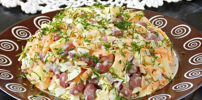 Моркву очищуємо й натираємо на тертці. Ріпчасту цибулю нарізаємо дрібними кубиками. Потім очищуємо яблуко. Нарізаємо кубиками. Яйця відварюємо й теж подрібнюємо. Всі інгредієнти викладаємо в миску. Також додаємо консервовану квасолю.