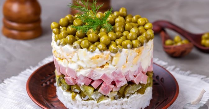 Такий салат трохи схожий на олів’є. На вигляд він дуже апетитний та смачний. Салат з рисом, шинкою, маринованим огірком та горошком простий у приготуванні та бюджетний.
