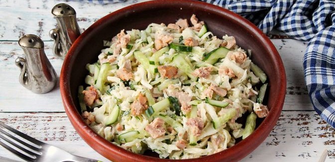 Салат дуже бюджетний та смачний. Він готується за лічені хвилини та швидко зникає з тарілки. Салат з печінкою тріски, капустою та огірком точно Вам сподобається. Він чудовий на смак та дуже апетитний.