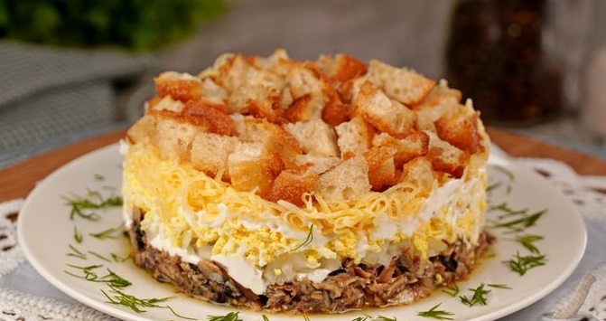Якщо полюбляєте смачні салати, то приготуйте їх на вечерю. За цим рецептом салат виходить дуже ситним. Він апетитний на вигляд та смачний. Салат зі шпротами, сиром та грінками точно Вам сподобається.