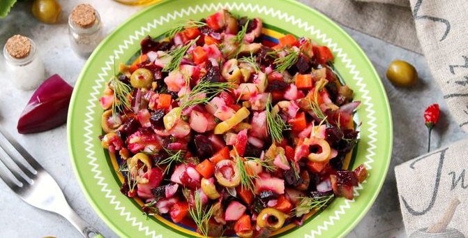 Для приготування цієї страви Вам знадобляться дуже прості й бюджетні інгредієнти. Вінегрет з оливками виходить смачним та апетитним на вигляд. Він готується надзвичайно швидко. Така страва точно Вам сподобається.