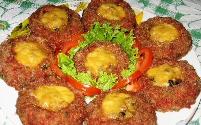 З фаршу робимо кульки. Формуємо в них заглиблення та викладаємо туди грибну начинку. Зверху посипаємо тертим сиром та ставимо в духовку. М’ясні гнізда запікаємо 20 хвилин при температурі 180 градусів. Смачного!