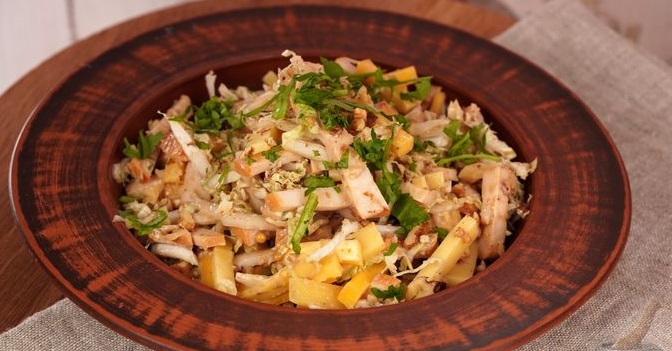 Салат з копченою куркою, пекінською капустою, сиром та горіхами