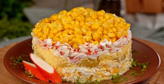 Салат з крабовими паличками, ананасом, сиром та кукурудзою