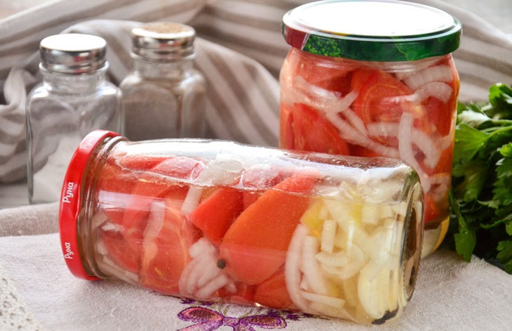 Спочатку стерилізуємо банки над водяною парою. На дно кладемо часник, лавровий лист та чорний перець. Помідори очищуємо від шкірки та нарізаємо на шматочки. Цибулю нарізаємо півкільцями.