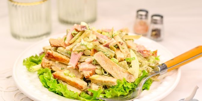 В салаті чудове поєднання інгредієнтів, тому він виходить дуже смачним. Страва бюджетна та проста у приготуванні. М’ясний салат з маринованими огірками та яблуками має легку кислинку. А ще він дуже ситний.