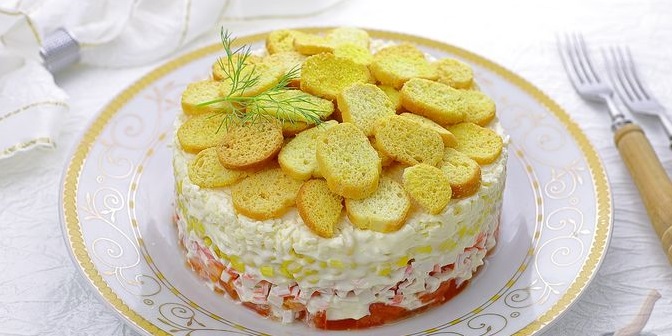 Потім викладаємо крабові палички. Також солимо, перчимо. Змащуємо майонезом. Наступний шар робимо з консервованої кукурудзи. Змащуємо майонезом. Плавлений сир натираємо та викладаємо наступним шаром. Потім салат прикрашаємо сухариками. Смачного!