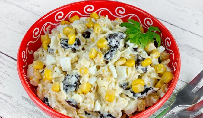 Такий салат простий у приготуванні та дуже смачний. Він складається з небагатьох інгредієнтів та має апетитний вигляд. Салат з чорносливом, сиром та кукурудзою точно сподобається Вашій сім’ї.