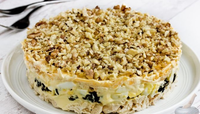 Багатошаровий салат з куркою, чорносливом, яблуком та горіхами