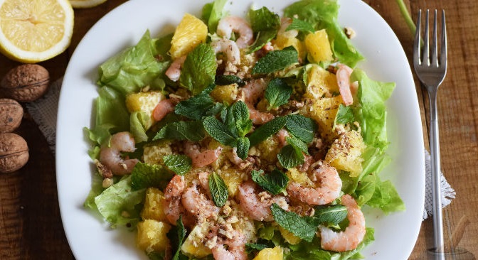 Апельсин очищуємо та нарізаємо кубиками. На тарілку викладаємо листя салату. Волоські горіхи обсмажуємо на сухій сковорідці, а потім збиваємо блендером. На листя салату викладаємо апельсин та креветки. Посипаємо горіхами.