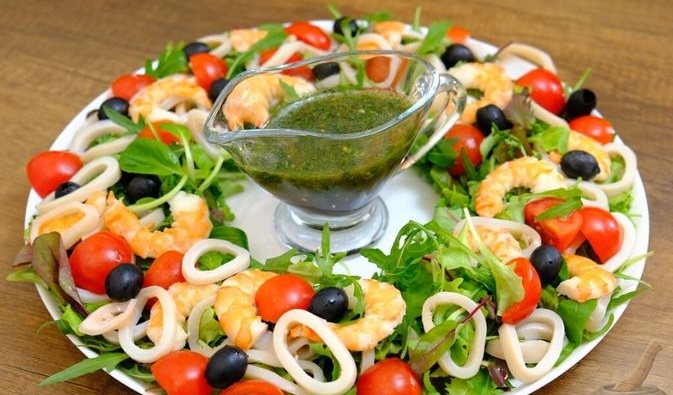 Салат з кальмарами, креветками та соусом з петрушки й часнику
