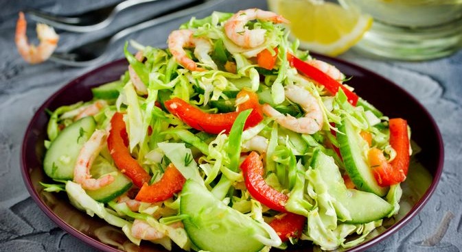 Салат з креветками, молодою капустою, огірками та болгарським перцем