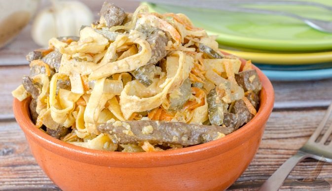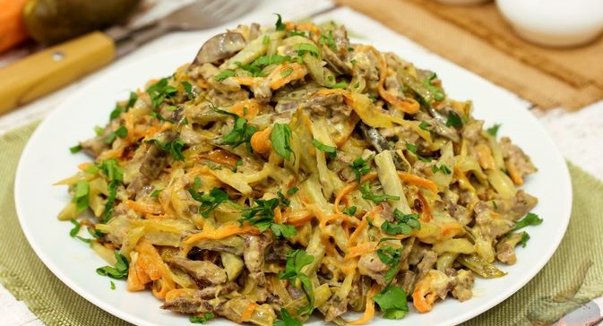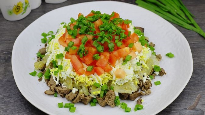 Такий салат готується з простих інгредієнтів, а виходить дуже смачним та ситним. Він має апетитний вигляд та чудовий аромат. Обов’язково приготуйте салат з печінкою за цим рецептом.