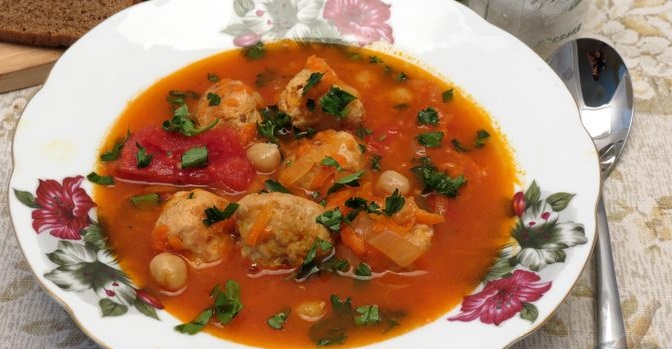 Спочатку приготуємо фрикадельки. До фаршу додаємо панірувальні сухарі, нарізану цибулю та яйце. Солимо, перчимо та перемішуємо. Потім робимо фрикадельки та відправляємо у киплячу воду. Моркву натираємо, а перець нарізаємо кубиками.