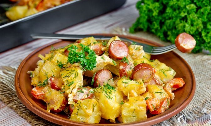 У приготуванні такої страви немає нічого складного. Для неї знадобляться прості та дуже бюджетні інгредієнти. Запечена картопля з сосисками, помідорами та сиром виходить апетитною, ситною та надзвичайно смачною.