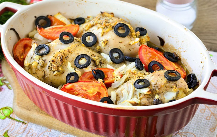 М’ясо поливаємо заправкою та перемішуємо. Зверху викладаємо нарізані помідори, ріпчасту цибулю та маслини. Ставимо в духовку та запікаємо приблизно 40 хвилин до готовності. Смачного!
